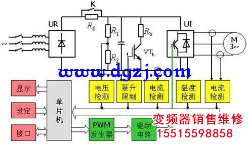 由整流,濾波,逆變,驅動以及微處理單元構成。一般通過驅動IGBT的開斷實現對輸出電壓與頻率的調整。實現調速與節能的功能。